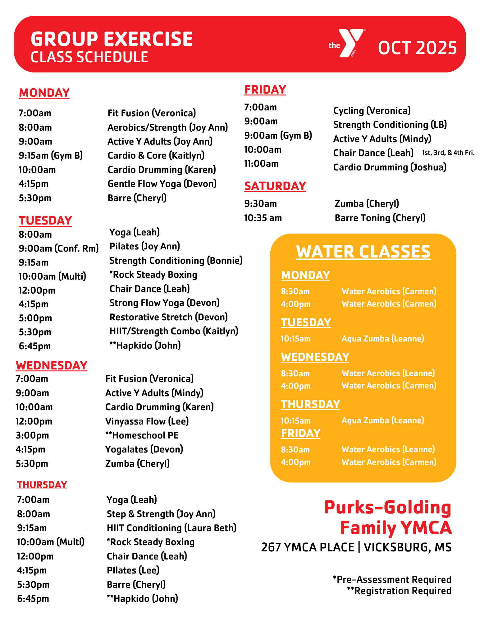 We offer a variety of programs from cycling and step, to Yoga and Pilates. Please visit the Purks-Golding courtesy desk for an updated class schedule and more information.